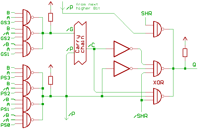 Note the SHR and !SHR control signal at the ALU output.