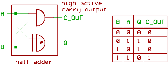 It uses a 7408 AND gate, and a 7486 XOR gate.