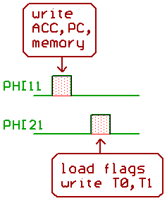 //looks like OAT1=!OAT0. OAT0 = !S2 & !S0 //address_bus=T0 in step 0, step 2 OAT1 = !S2 & S0 | S2 //address_bus=T1 in step 1,3,4,5 ODT0 = !S2 & S1 & !S0 & !CMD10 //data_bus=T0 in step 2 if CMD10=0 //T0->T1 ODT0 |= S2 & !S1 & !S0 & CMD8 & CMD7 //data_bus=T1 in step 4: memory write LT0 = PHI21 & !S2 & S0 //load T0 in step 1,3 LT0 |= PHI21 & S2 & !CMD8 //load T0 in step 4,5 if CMD8=0 LT0 |= PHI21 & S2 & !S1 & S0 & CMD7 //load T0 in step 5 if CMD7=1 LT1 = PHI21 & !S2 & !S0 //load T0 in step 0,2 LIR = PHI21 & !S2 & !S1 & !S0 //load instruction register in step 0 LPC = PHI11 & !S2 & !S1 //load PC in step 0,1 LACC = PHI11 & S2 & !S1 & !S0 & !CMD8 & CMD7 //load ACC in step 4 ? OACC = !S2 & !S1 & S0 & !CMD11 & TRUE & !RES_FLAG //step 1: ACC as index OACC |= !S2 & S1 & S0 & !CMD9 //step 3: read ACC for data calculation OPC = !OACC