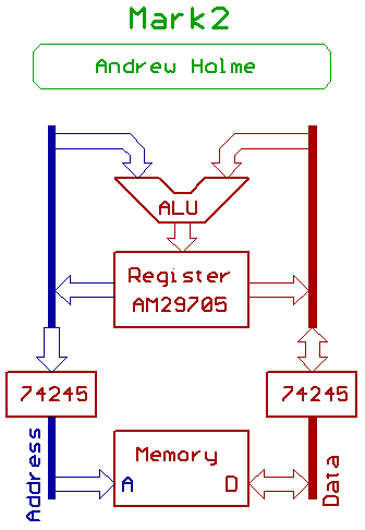 There is sort of a bi_port register file, the outputs feed the (74181 based) ALU