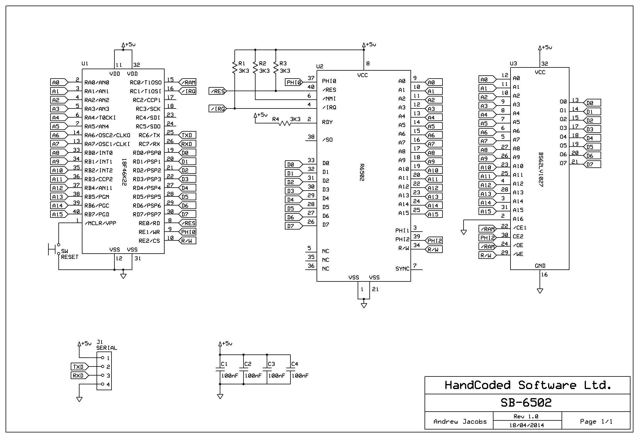 64K SRAM chips are rare so I decided to use a 128K chip with the A16 pin tied permanently to ground. This wastes half the chip but means that only a single chip select line is needed freeing the other pins on the PIC to signal IRQ interrupts and control an SPI device.