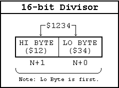At the end, the 16-bit quotient is in N+4 & N+5, and 16-bit remainder is in N+2 & N+3 both with low byte first, as usual for 6502, like the divisor shown above. In other words, the remainder and quotient end up in the same memory bytes that originally held the dividend.