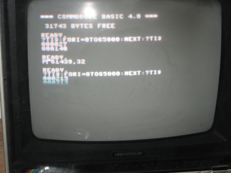 Screenshot of a timing measurement. On the top of the screen you see the result of the original speed, then copying (SYS33792 where I assembled the test to), then POKEing the control register to fast speed and measuring again.