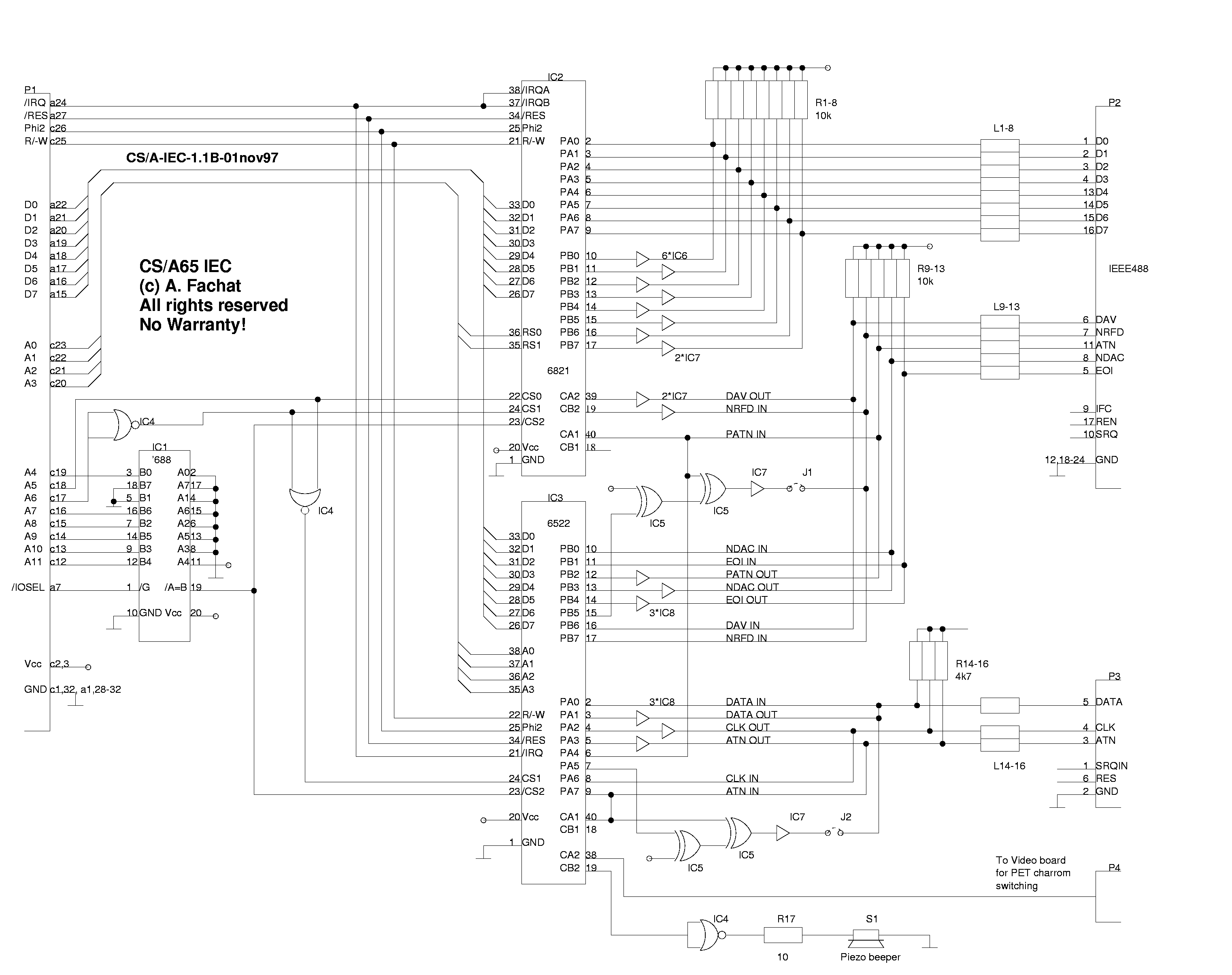 | This board is only partially compatible with the Commodore PET IEEE488 interface, although it uses the same I/O address. It adds, however, the ability to be used as a device (for both the IEEE488 and the IEC bus). | |