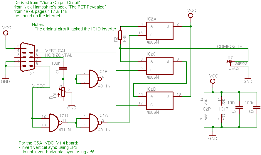 | To use the vdc board with a standard TV set for example, a so-called "composite video" signal must be generated, that includes all three video, horizontal sync and vertical sync signals. This board is derived from the "Composite Video Circuit" from the book "The PET revealed". | |