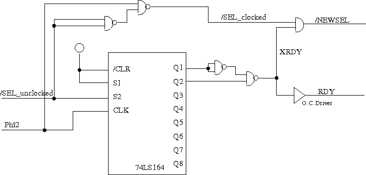 Note: it is important, that the Phi2 going high signals arrives a the AND-gate before the shift register and Q1/Q2 logic releases XRDY, so that there is no inactive spike on the /NEWSEL line. This is accomplished by the gate delay times.