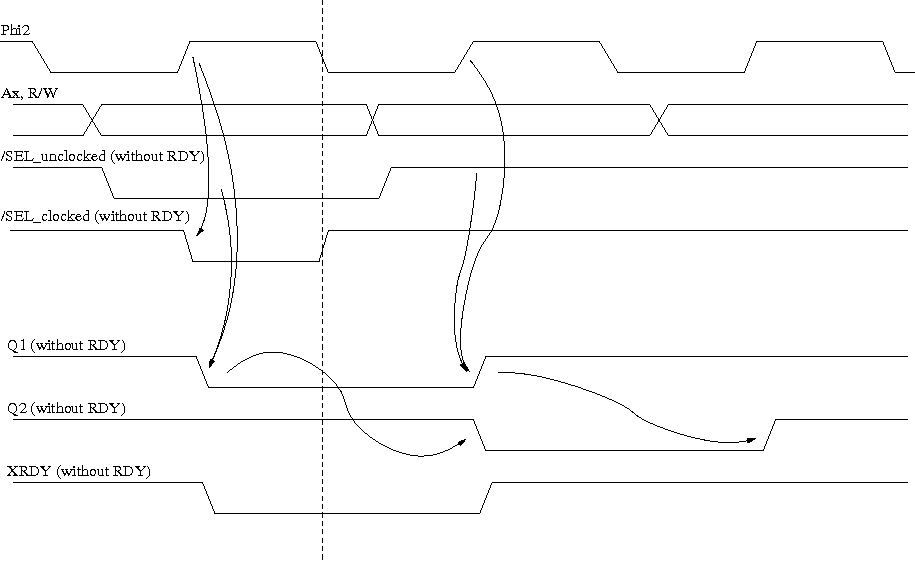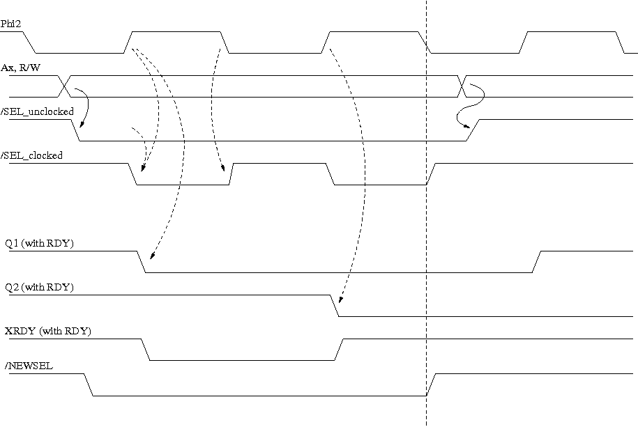 - /SEL_clocked: This line is the /SEL_unclocked line combined with the Phi2 clock. It is used for devices that need the Phi2 timing on write accesses. This line must be handled specially when RDY is asserted, as it goes inactive during Phi1.