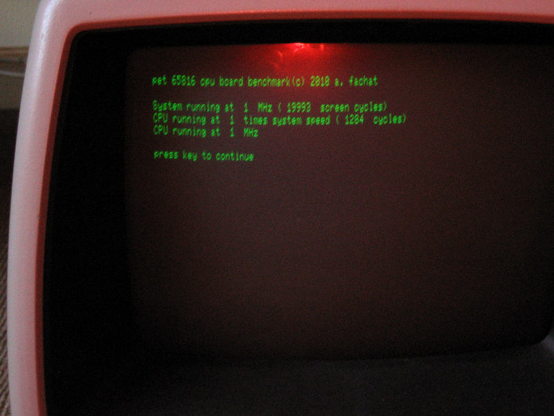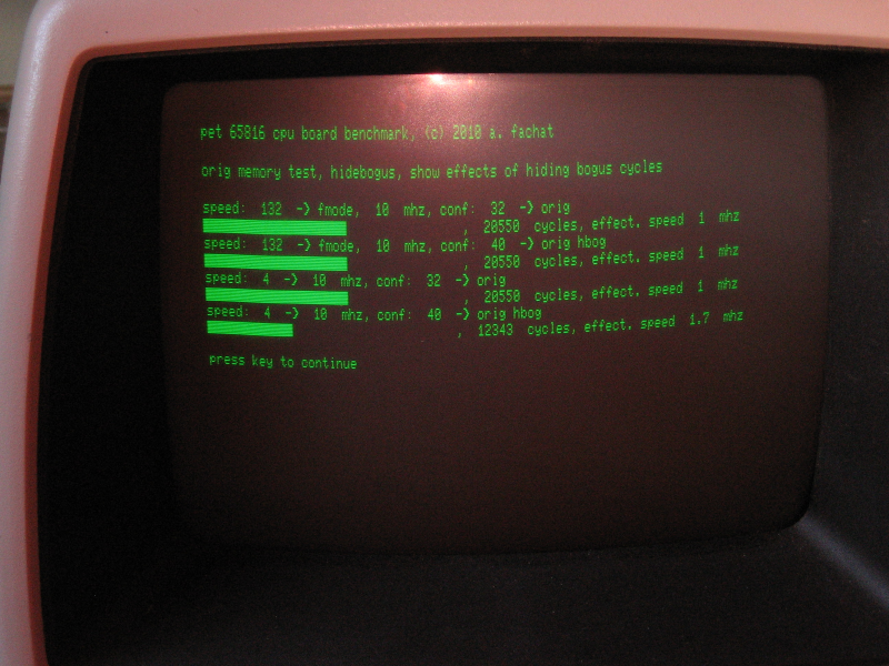 Each benchmark has two lines. The first line shows the configuration for the clock register ("speed"), and control register ("conf"), plus it names the actual bits that are set for convenience. The second line shows the benchmark result in terms of system cycles for the benchmark loop, and the speed calculated from that.