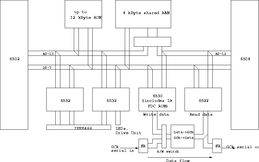 The architecture is actually a quite elegant solution to wire two CPUs together, as well as it has an ingenious method of handling GCR data in hardware. The following block diagram shows this (click to enlarge):
