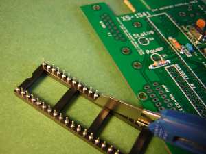 Then solder pins 1 and 21 of the socket. Check if the socket is fully inserted and plain on the board. If not, heat one of the soldered pins with the soldering iron, and press the socket against the board. Repeat also with the second soldered pin until the socket fits. Then solder the rest of the pins.