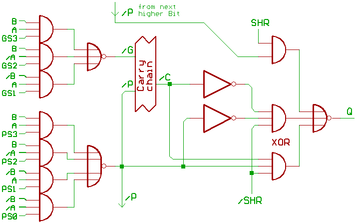 Note the SHR and !SHR control signal at the ALU output.