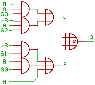 S3,S2=00: Y=0 S3,S2=01: Y=A&/B S3,S2=10: Y=A& B S3,S2=11: Y=A S1,S0=00: X=A S1,S0=01: X=A| B S1,S0=10: X=A|/B S1,S0=11: X=1 Q=1, if X=Y.