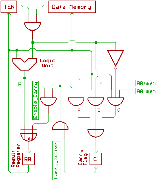 the Result Register (RR) and the Carry Flag (C).
