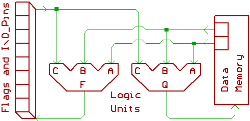 The select inputs A,B are read from data memory, while C is read from the Flags