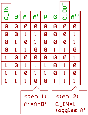 U=1, V=0, X=0, Y=0, CEN=1: A''=A'^carry.