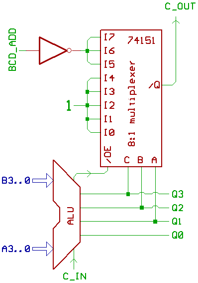 of the 74151 is 1, forcing the !Q output (and C_OUT) to 1.