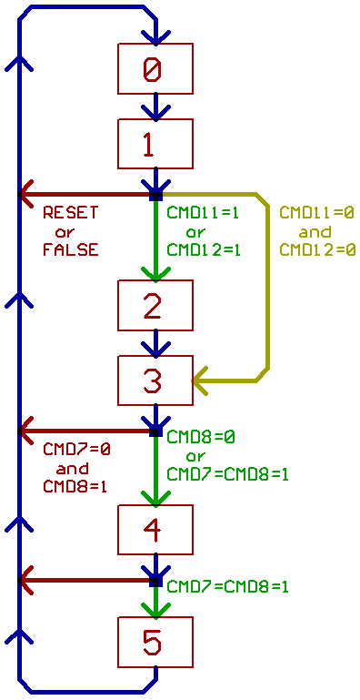 //fetch OpCode word 0->1 //fetch parameter word, and start address calculation //cycle trough state 2 and 3, if CMD12=1 or CMD11=1 1->2 if TRUE, no RESET, CMD11=1 1->2 if TRUE, no RESET, CMD12=1 1->3 if TRUE, no RESET, CMD12=CMD11=0 //immediate: do data calculation 2->3 //address calculation/indirect //do data calculation, finished if "write result back to PC" 3->4 if CMD8=0 //write acc/don't write //write memory 3->4 if CMD8=CMD7=1 //memory write enable active 4->5 if CMD8=CMD7=1