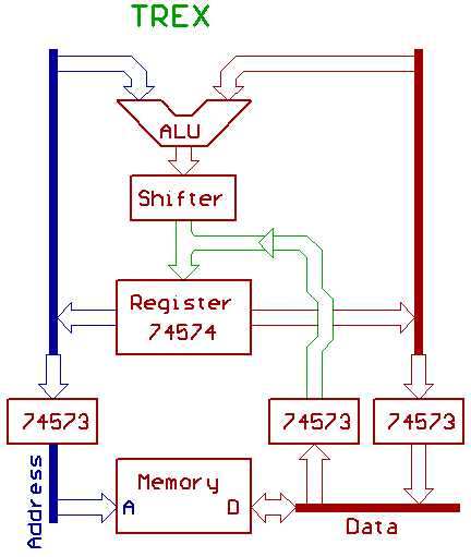 There is sort of a bi_port register file, the outputs feed the (74181 based) ALU