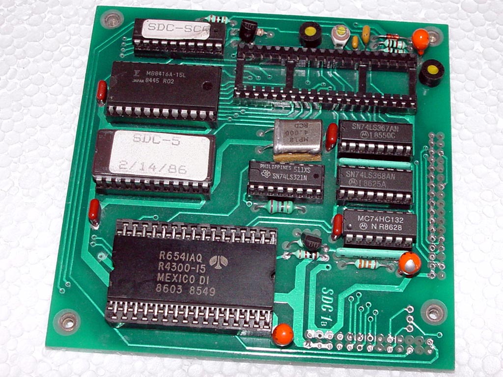 I still don't know exactly what this is but I can now make a few guesses. I believe the board was made by Sigma Designs who have made a few disk controllers with the SDC prefix. I can identify all the chips except the missing 40 pin DIL and that I suspect is a Western Digital WDxxxx floppy disk controller.