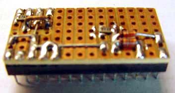 The circuit is built on a small piece of stripboard that has been soldered onto a 28 pin