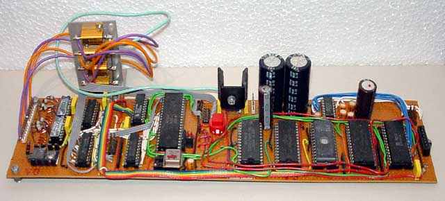 At the back are the motor current limit resistors then, on the board from left to right, are the motor and pen drivers, output latches, input buffer and decoding, CPU and XTAL osc., reset switch and +5V regulator, lower 32k RAM, upper 32k RAM and smoothing caps, 32k ROM and MAX232, 6551 ACIA and more smoothing caps and finally the 6840 counter timer chip.