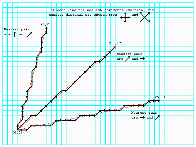 The routine.Drawing a line between any two arbitary points on a grid the exact line cannot be drawn as we are limited to either horizontals, verticals or diagonals. So to draw a representation of the line on the square lattice the program can only generate the best approximation.