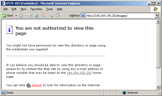 If the HTTP GET request is for the images or errors directory then an error 403 is served. This is actually the default file, index.html, for each directory and gives the illusion that there is some form of security protecting the filesystem. Like the 404 error response this can easily be changed to whatever you wish by editing the file index.html in the each directory.