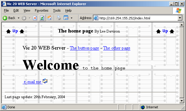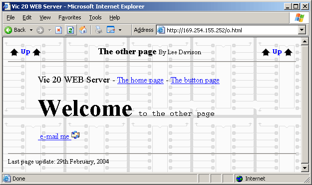 These are the three pages as served by the Vic 20 network driver. While not much to look at they do provide proof that even a computer like the Vic can be used as a web server. With more space available to hold web content than in the EhBASIC web server the pages are a little longer and two new images have been added. /images/back.png is the 127 by 162 pixel monochrome background image and /images/up.gif is the 64 by 20 pixel image used as the "Up" link on these pages.