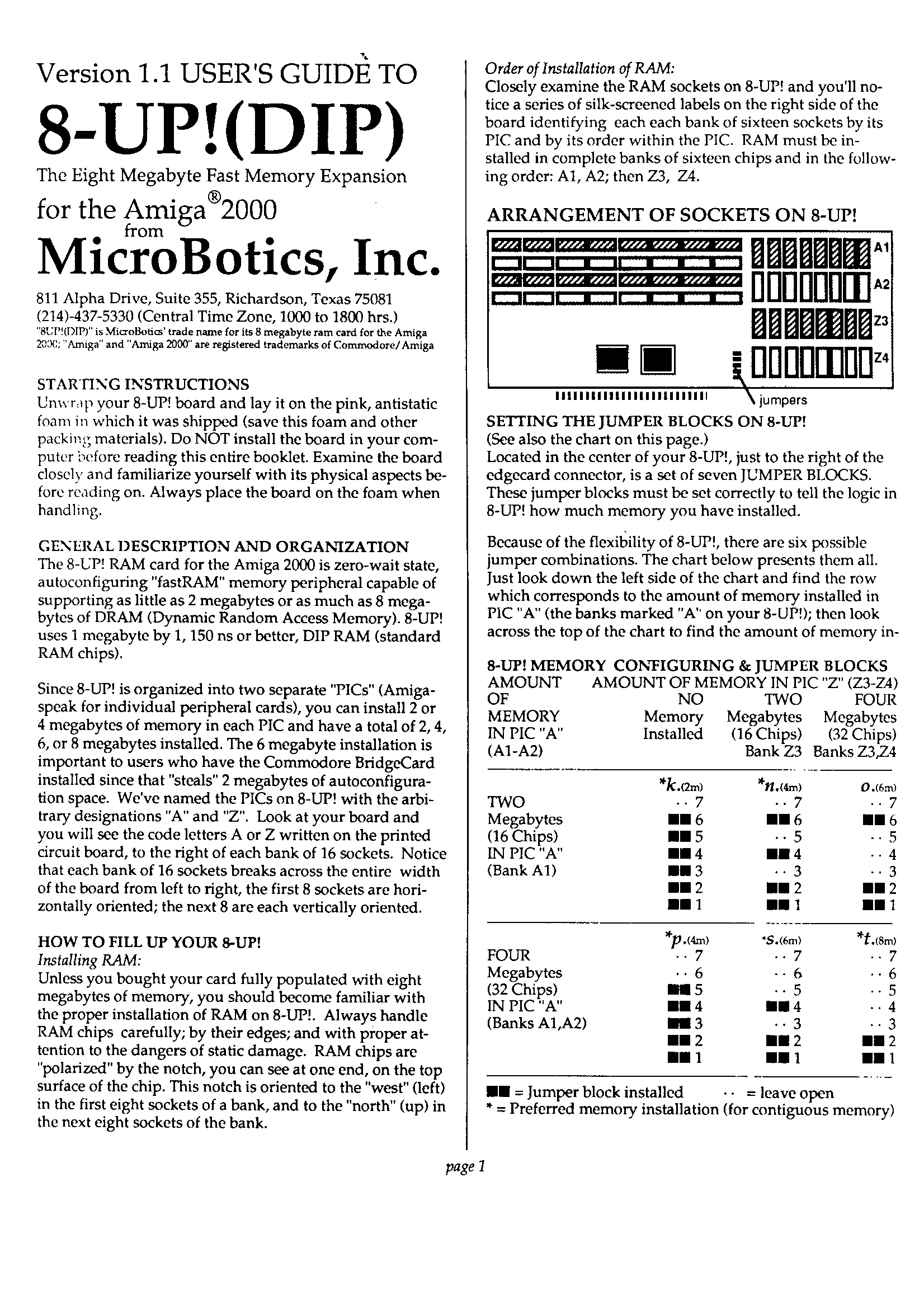 The 8-UP! RAM card for the Amiga 2000 is zero-wait state, autoconfiguring "fastRAM" memory peripheral capable of supporting as little as 2 megabytes or as much as 8 megabytes of DRAM (Dynamic Random Access Memory). 8-UP! uses 1 megabyte by 1, 150 ns or better, DIP RAM (standard RAM chips).HOW TO FILL UP YOUR 8-UP!Since 8-UP! is organized into two separate "PICs" (Amiga-speak for individual peripheral cards), you can install 2 or 4 megabytes of memory in each PlC and have a total of 2, 4, 6, or 8 megabytes installed. The 6 megabyte installation is important to users who have the Commodore Bridgeboard installed since that "steals" 2 megabytes of autoconfiguration space. We've named the PICs on 8-UP! with the arbitrary designations "A" and "Z". Look at your board and you will see the code letters A or Z written on the printed circuit board, to the right of each bank of 16 sockets. Notice that each bank of 16 sockets breaks across the entire width of the board from left to right, the first 8 sockets are horizontally oriented; the next 8 are each vertically oriented.