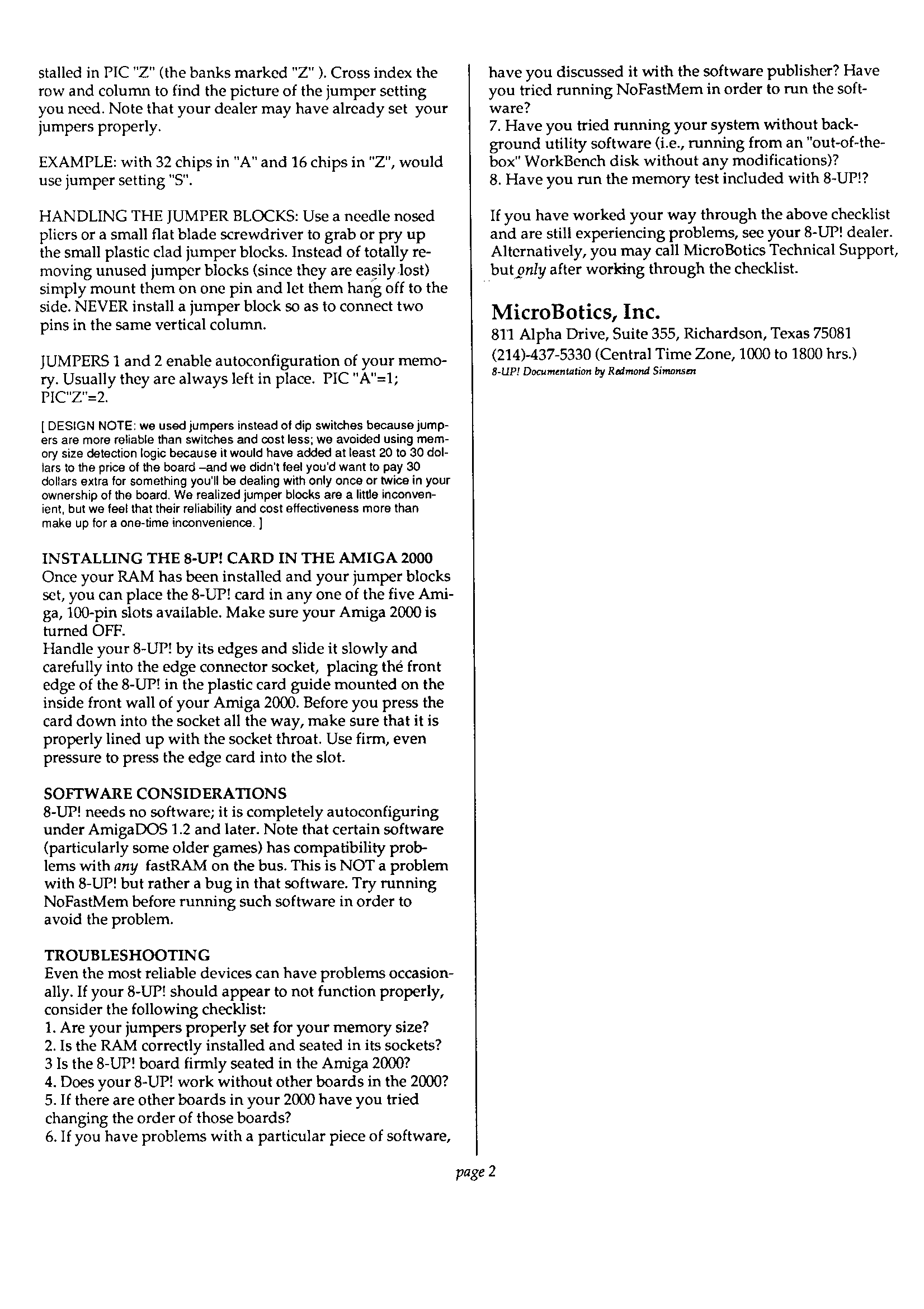 Use a needle nosed pliers or a small flat blade screwdriver to grab or pry up the small plastic clad jumper blocks. Instead of totally removing unused jumper blocks (since they are easily lost) simply mount them on one pin and let them hang off to the side. NEVER install a jumper block so as to connect two pins in the same vertical column.INSTALLING THE 8-UP! CARD IN THE AMIGA 2000JUMPERS I and 2 enable autoconfiguration of your memory. Usually they are always left in place. PlC"A"=l; PIC"Z"=2.