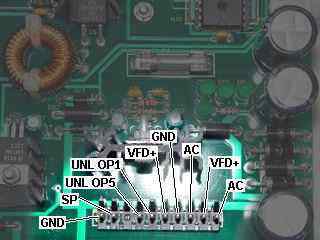 GND DC 0v rail SP Loud speaker Key No pin UNL OP5 Output 5 from the UNL2003 UNL+ +ve supply for the UNL2003 VFD+ +ve supply for the VFD drivers GND DC 0v rail AC AC input VFD+ +ve supply for the VFD drivers AC AC input