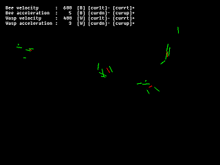 Swarm has individual wasps being chased round the screen by swarms of bees. Bee and wasp speed and acceleration parameters can be changed while the program is running. This update for EASy68K 3.6 beta or above adds window size control and treats the mouse pointer as a wasp. Updated V1.01 |