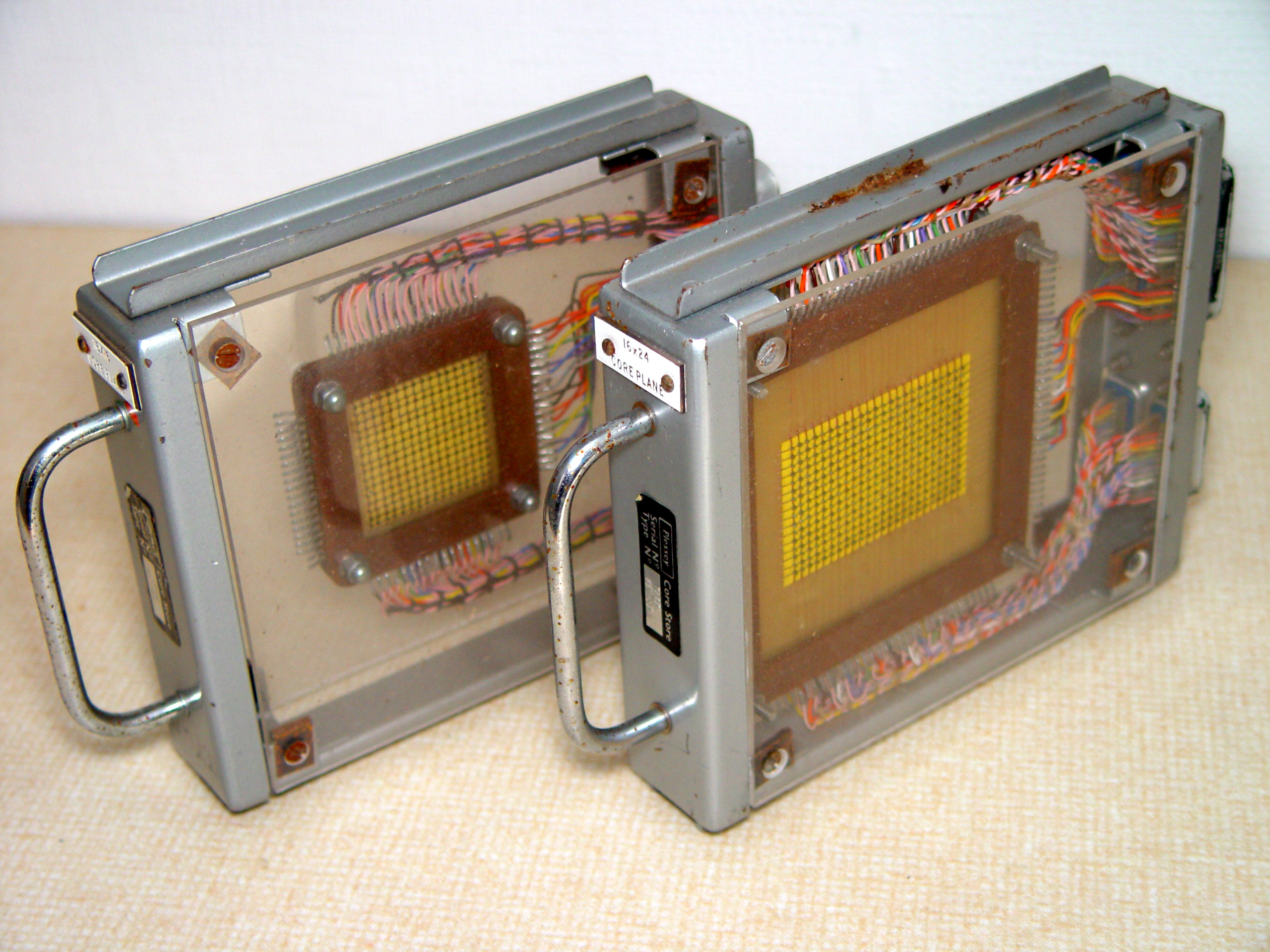 Here are some pictures of core stores from a KDF 9 computer that was in service from 1964 to 1979. These belong to an ex-programmer and field service engineer.These thumbnails are links to large, 2560 x 1920 pixel, jpeg images. The large images are each about 1.2MB in size.